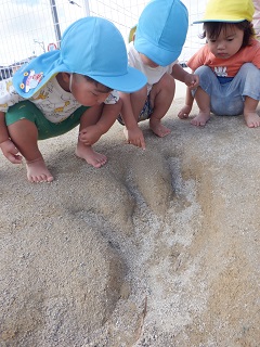 保育士 「大きな足跡みたいだね。誰の足跡かな...?」