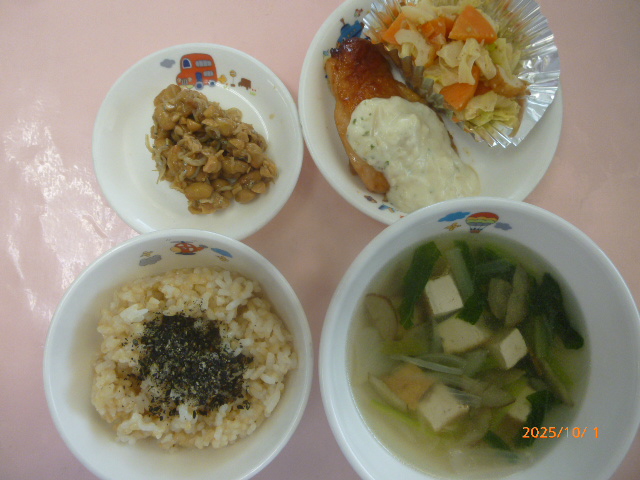 | 1(水) |  | ひよこ豆入り合わせご飯・鶏肉のタルタルソースがけ・キャベツのごま和え・しらす納豆・すまし汁 |