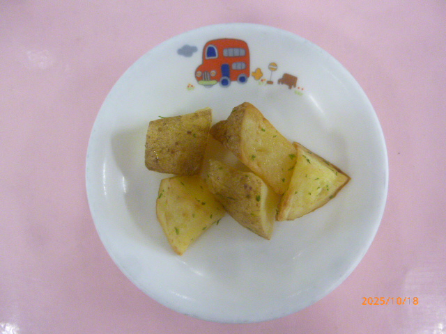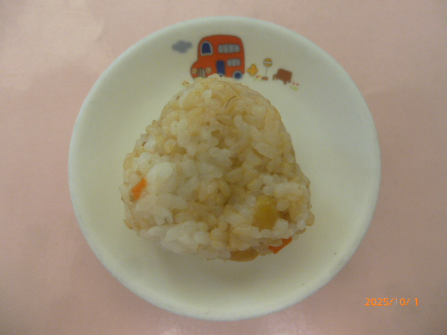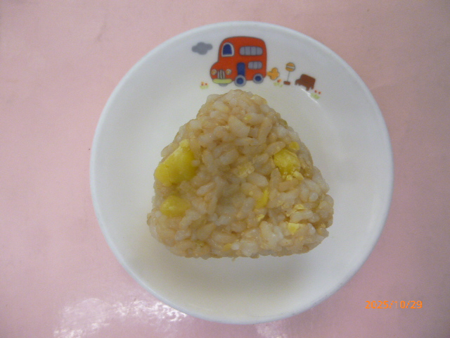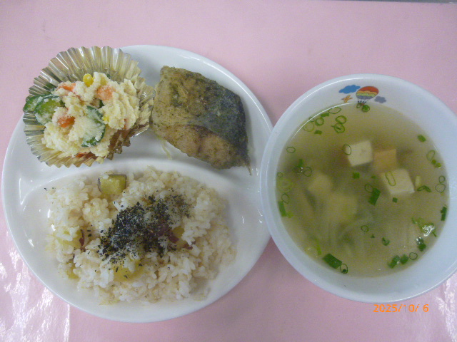 | 6(月) |  | さつま芋ご飯・お魚ののり塩焼き・おからポテトサラダ・すまし汁 |