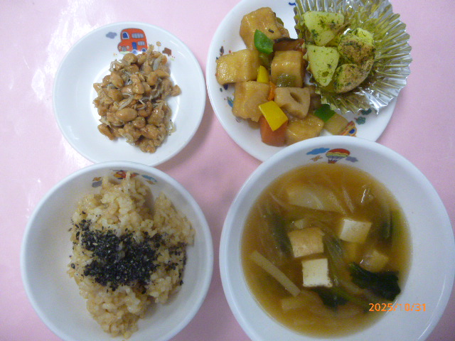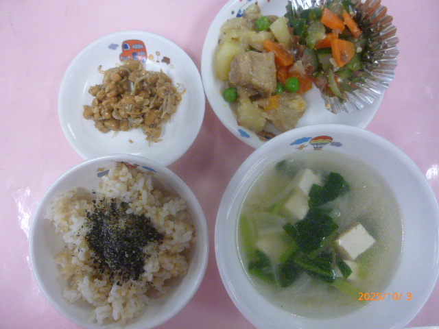 | 2(木) |  | 雑穀入り合わせご飯・お魚の煮つけ・根菜のきんぴら・お野菜納豆・すまし汁 |