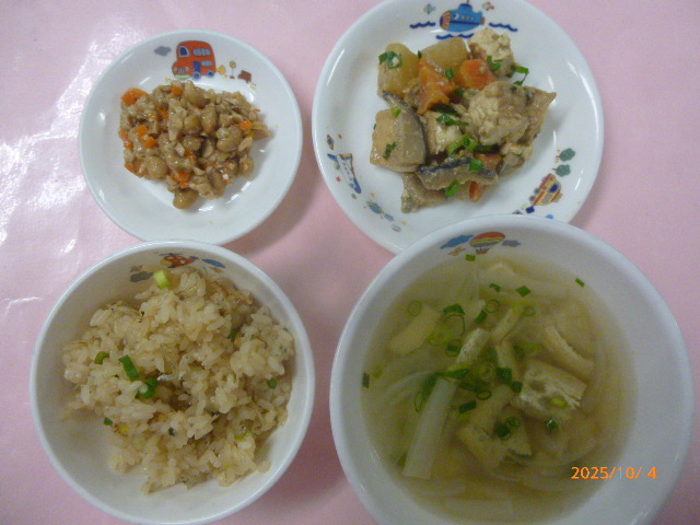 | 4(土) |  | しらすご飯・厚揚げのごま味噌煮・お野菜納豆・すまし汁 |