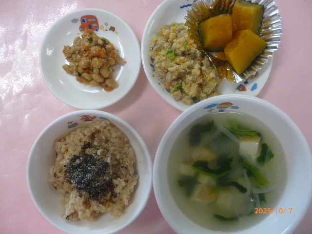 | 7(火) |  | 小豆入り玄米ご飯・炒り卯の花・南瓜の煮物・お野菜納豆・すまし汁 |