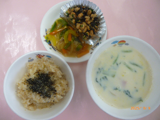 | 9(木) |  | 雑穀入り玄米ご飯・お魚のカレーあんかけ・ひじき納豆・豆乳スープ |