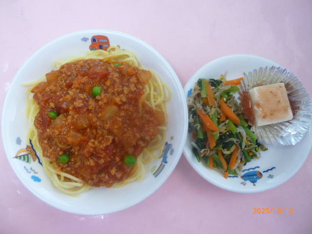 | 10(金) |  | 味噌ミートスパゲティ・青菜のじゃこ和え・豆乳寒天(いちご) |