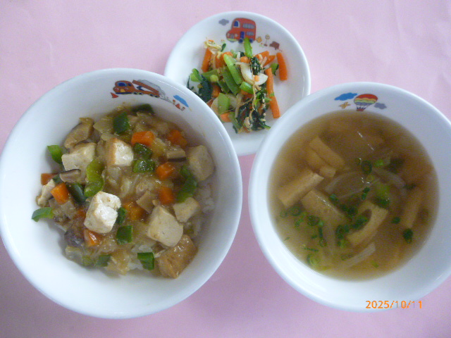 | 11(土) |  | 塩麻婆厚揚げ丼・青菜のナムル・すまし汁 |