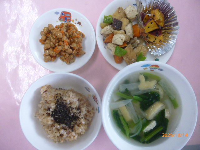 | 14(火) |  | 小豆入り玄米ご飯・厚揚げの中華煮・お野菜納豆・大学芋・すまし汁 |