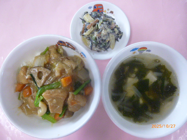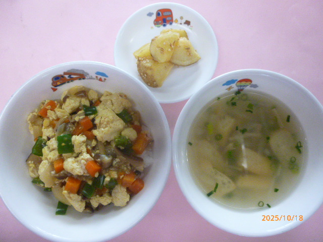 | 18(土) |  | 炒り豆腐のカレー風味丼・じゃが芋の味噌絡め・すまし汁 |