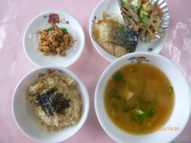 | 20(月) |  | アマランサス入り玄米ご飯・お魚の煮つけ・根菜の豆乳マヨ和え・お野菜納豆・お味噌汁 |