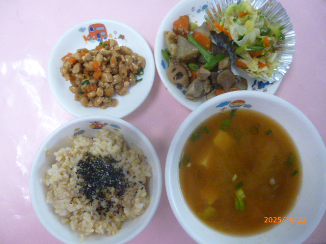 | 22(水) |  | ひよこ豆入り玄米ご飯・筑前煮・ごまじゃこサラダ・お野菜納豆・お味噌汁 |