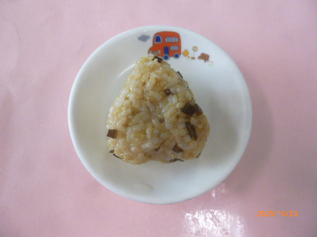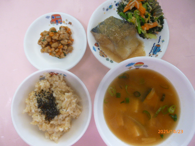 | 23(木) |  | 雑穀入り玄米ご飯・お魚のおろし煮・青菜のごま和え・お野菜納豆・お味噌汁 |