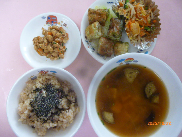| 28(火) |  | 小豆入り玄米ご飯・ちくわの磯辺揚げ・もやしのごま酢和え・お野菜納豆・お味噌汁 |