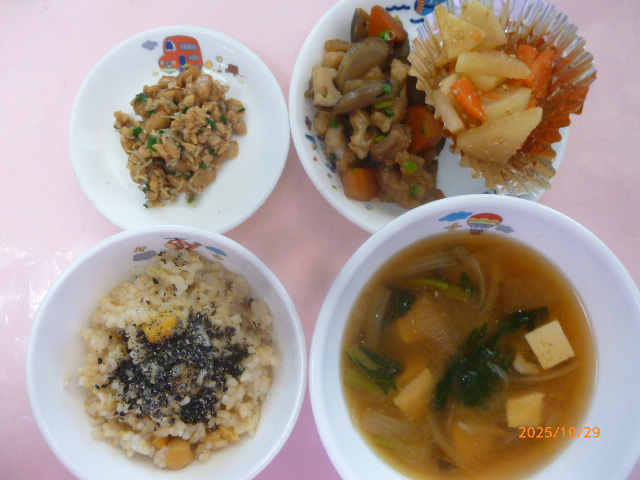 | 29(水) |  | ひよこ豆入り玄米ご飯・鶏ごぼう・大根のカリカリ漬け・しらす納豆・お味噌汁 |