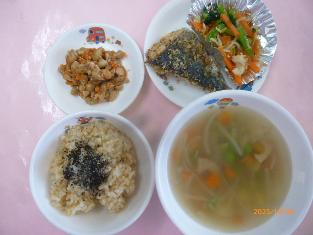 | 30(木) |  | 雑穀入り玄米ご飯・お魚のパン粉焼き・もやしのナムル・お野菜納豆・お野菜スープ |