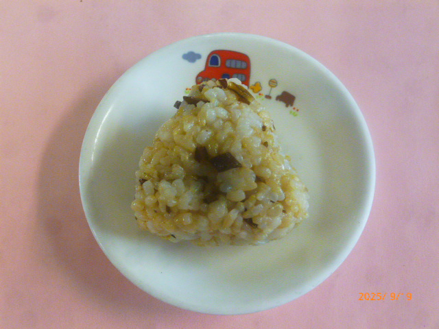 8(月) |  | きのこの炊き込みご飯・お魚のカレー焼き・ほうれん草の白和え・お味噌汁 |