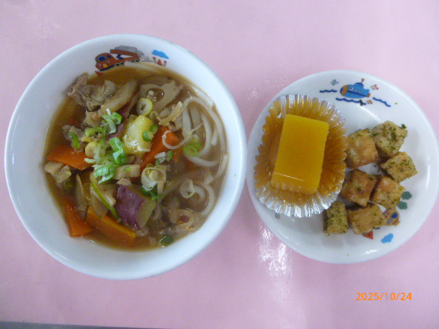 豚汁うどん・高野豆腐の青のり揚げ・オレンジ寒天
