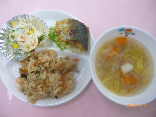 五目炊き込みご飯・お魚のカレー焼き・おからポテトサラダ・玄米スープ