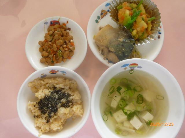 雑穀入り玄米ご飯・お魚の味噌煮・じゃが芋のきんぴら・お野菜納豆・すまし汁
