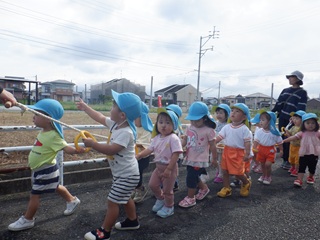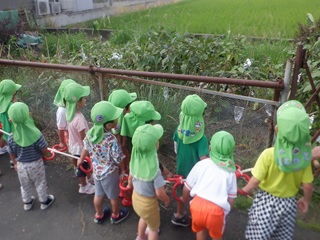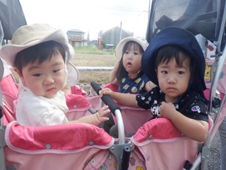つぼみぐみさんは、ベビーカーに乗って、さくらぐみ・ももぐみさんは誘導ロープを持って目的地まで歩いていきました!