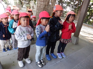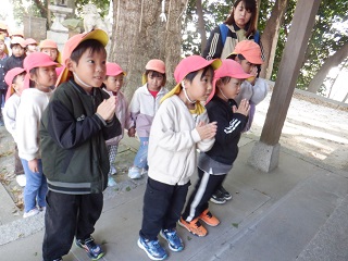 たけ・まつぐみさんで手を繋ぎ、八所神社まで歩いてお参りに行きました。七五三の由来や“今のくらしができていることに感謝の気持ちをもとう”という話をすると、真剣な表情で聞いてくれました。お賽銭を入れ鈴を鳴らした後は「元気に大きくなれますように…」と手を合わせてお祈りをし、少し誇らしげだったお友だち。お次は…理事長先生にバスで迎えに来てもらって水巻中央幼稚園へ。七五三コンサートでは「さんぽ」や「夢をかなえてドラえもん」など、みんなが大好きな曲が演奏されると、一緒に口ずさんだり手拍子をしたりと、ノリノリで聞いていました。これからもみんなで仲良くたくさん遊んで、健やかに成長していってくれることを願っています。